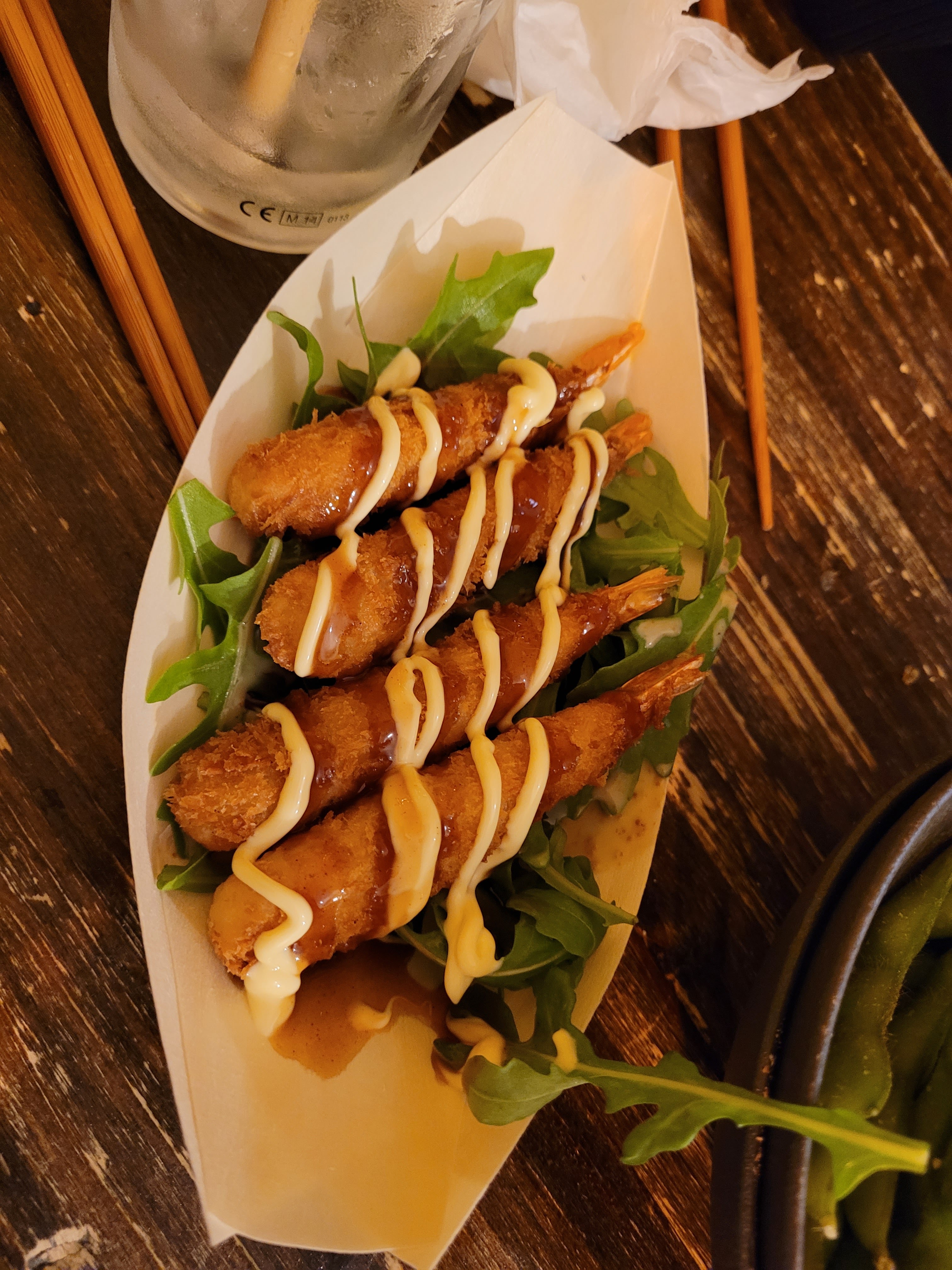 L'ambiance est agréable, le personnel également. L'esthétique est recherchée, similaire à certains lieux au Japon. Les crevettes panées étaient très bonnes, une panure légère et un bon goût de crevette.