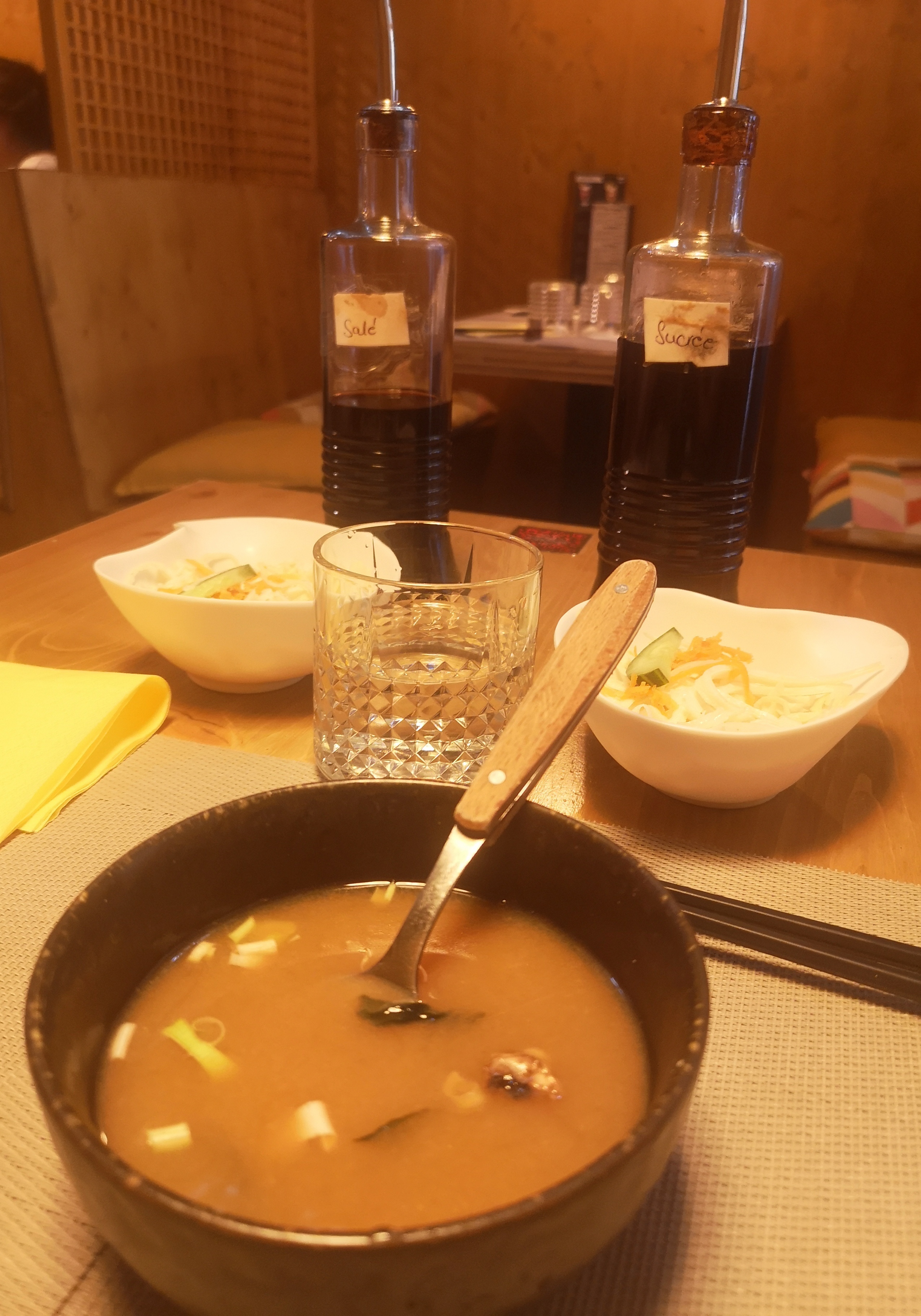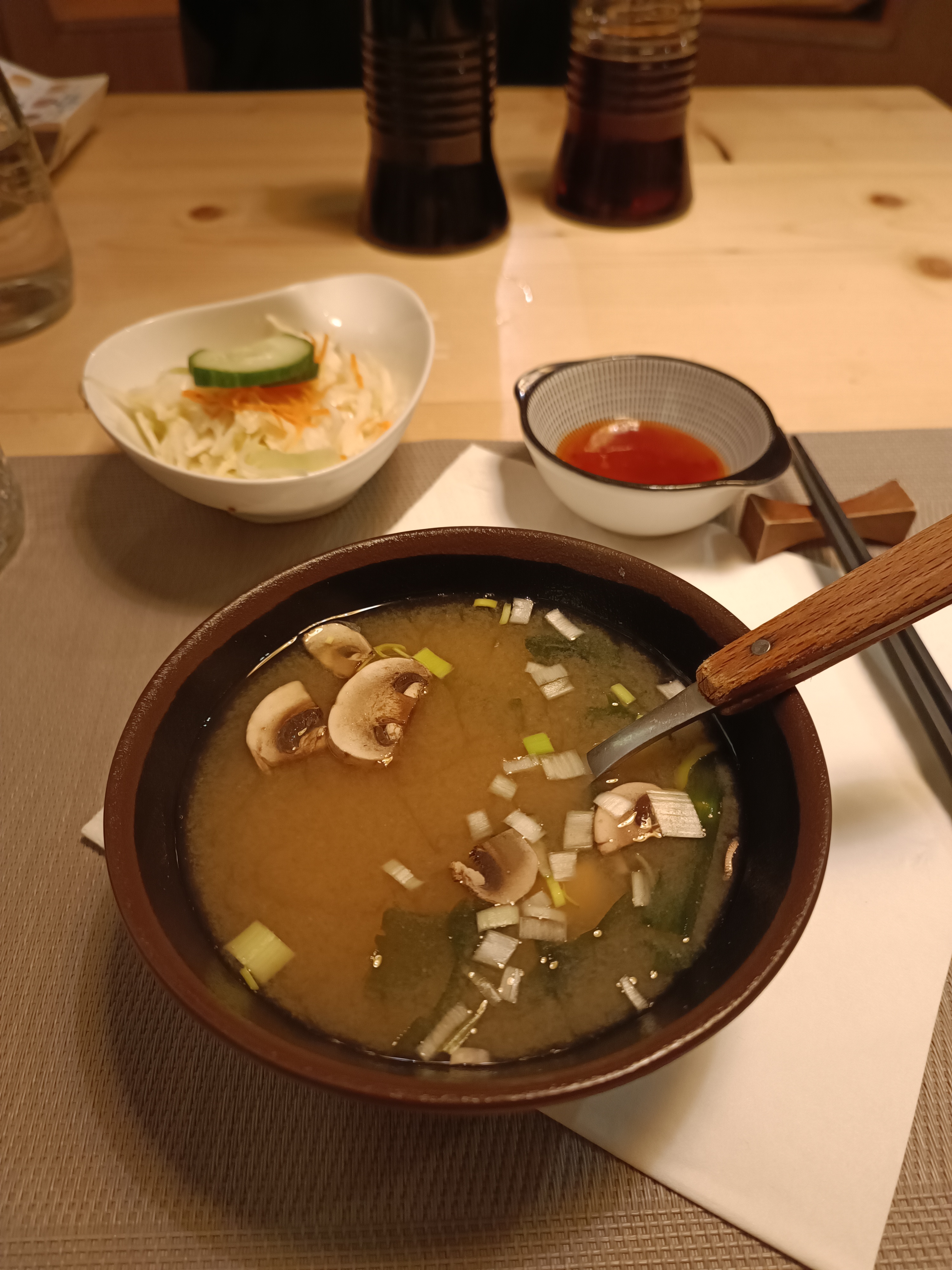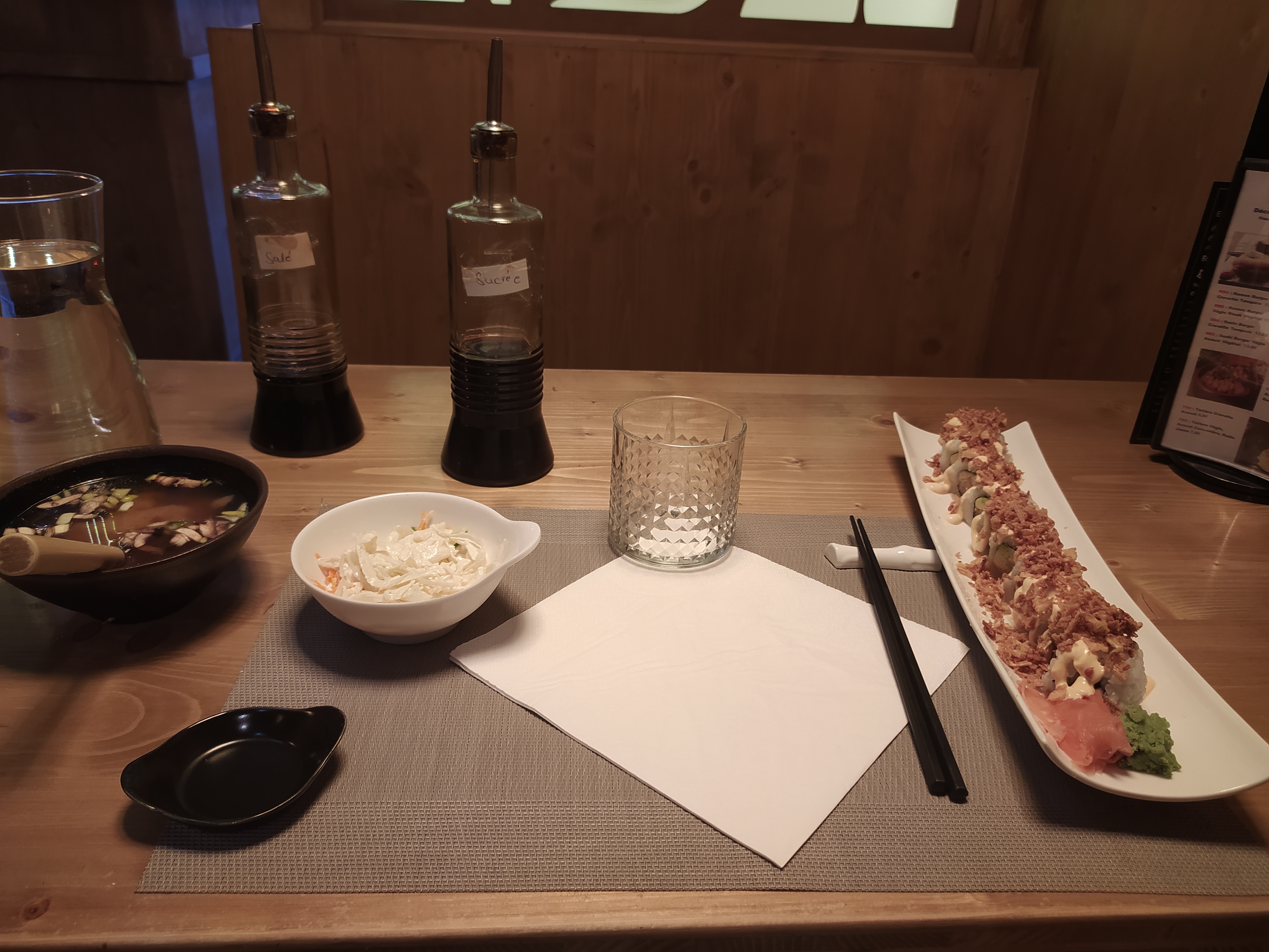 La soupe miso et la salade de chou sont pas incroyable mais les sushis sont très bon l'ambiance est bien je recommande si vous voulez des sushis rapidement