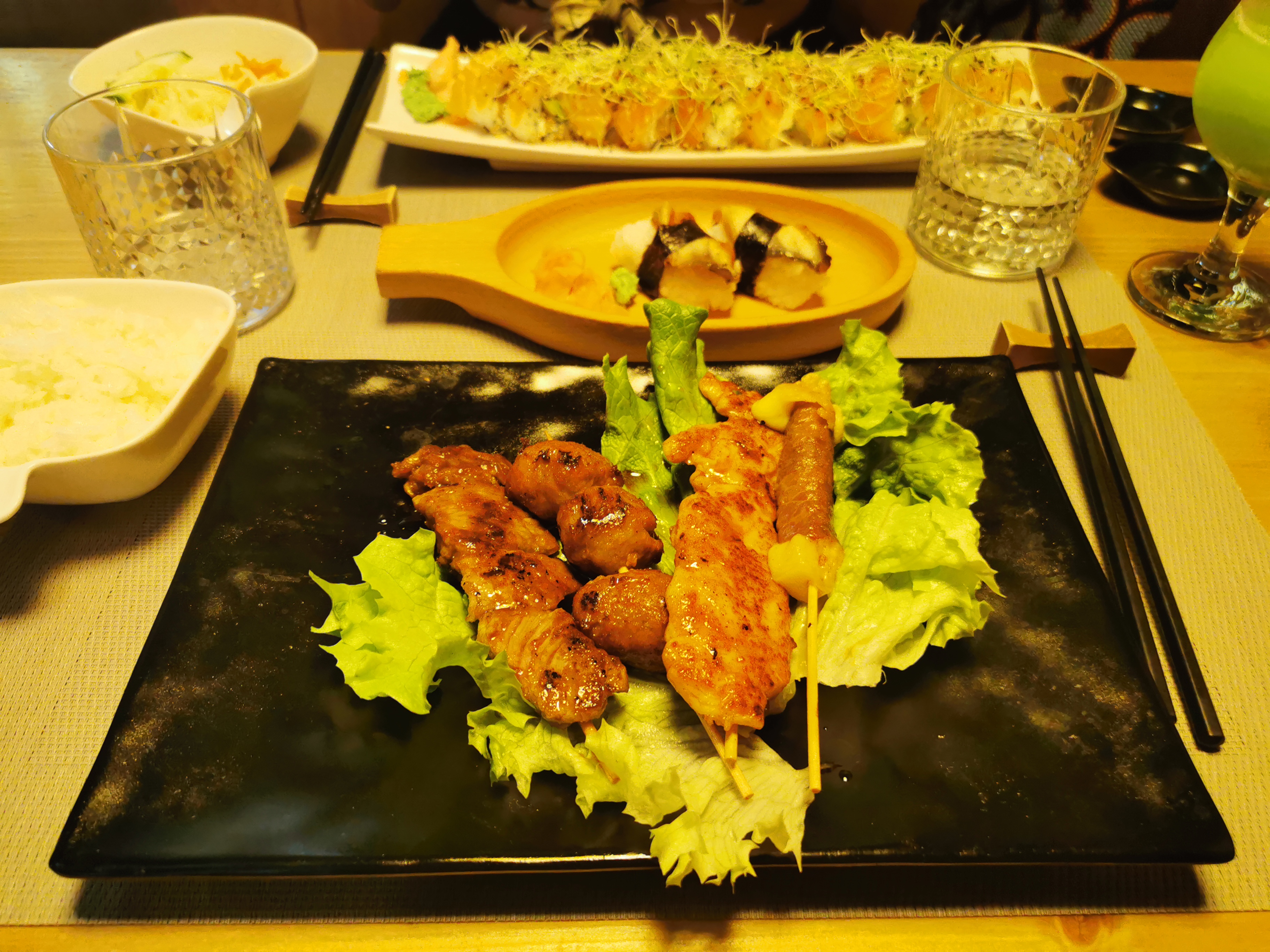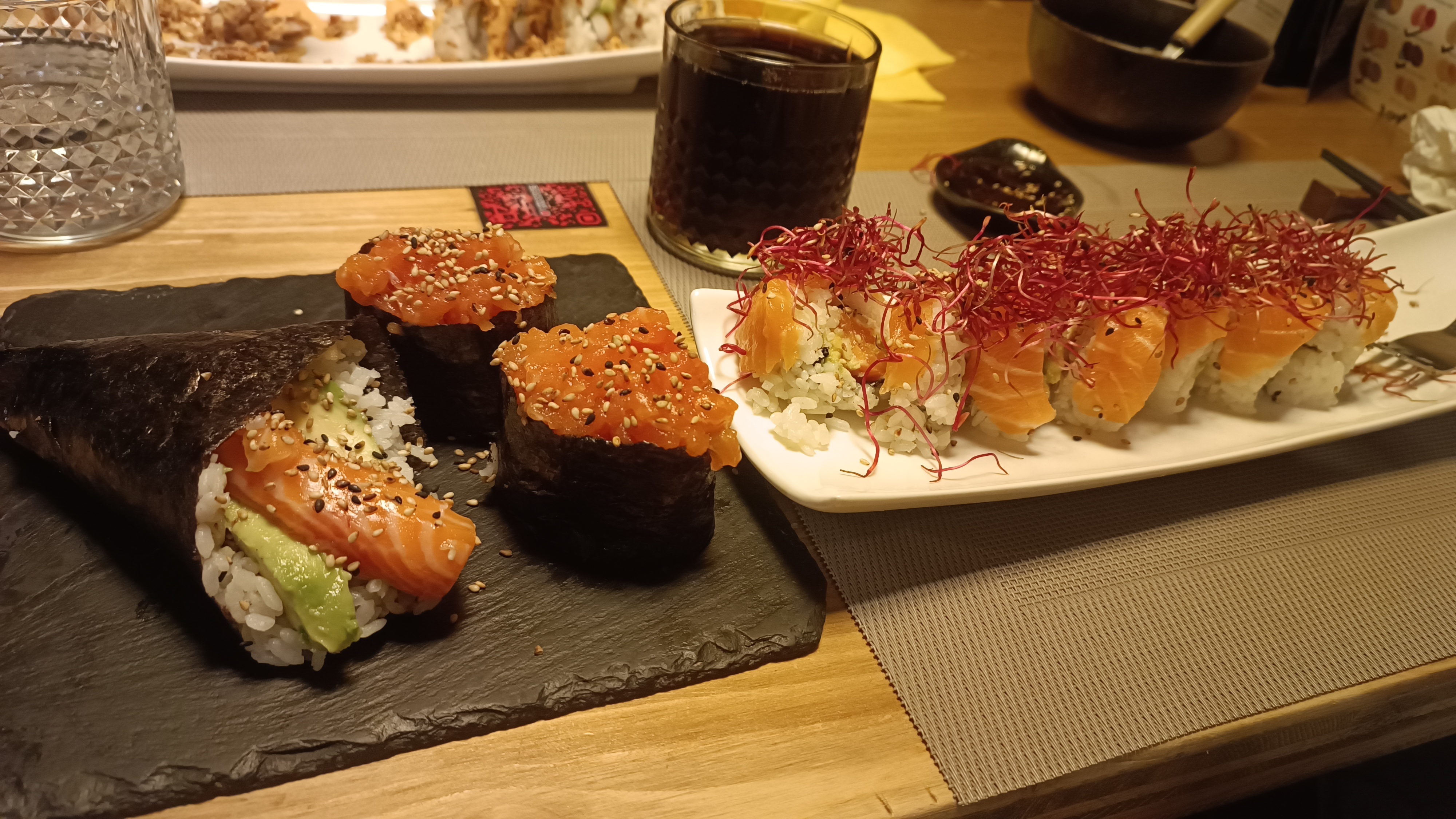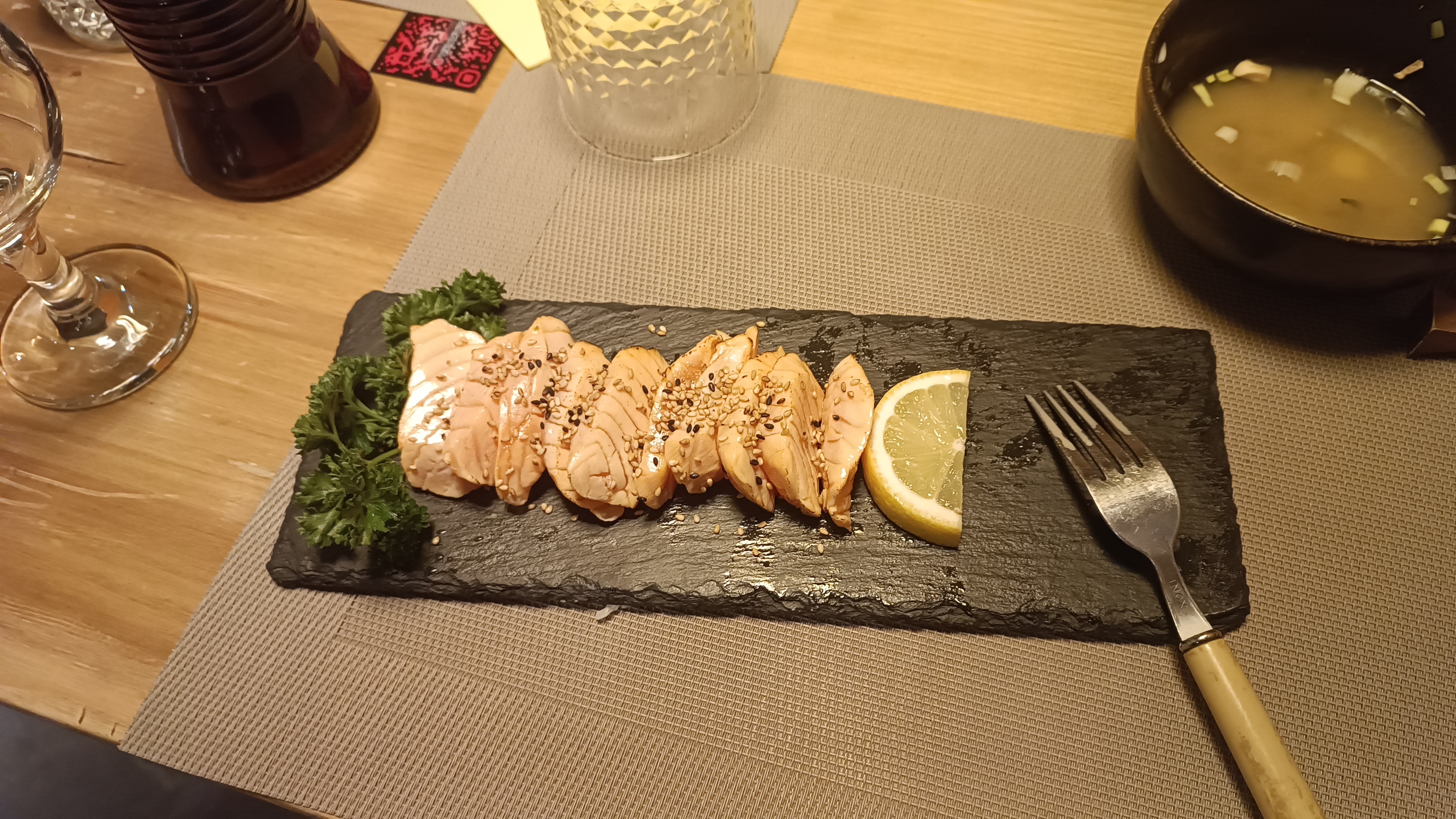 Globalement correct, pourrait être amélioré en quelques points simples. Les menus et cartes devraient être mis à la poubelle et renouvelés. Le service est correct, non n'avons pas attendu. Le ballet des livreurs ne nous a pas gêné outre mesure dans le sens où le service en salle nous a paru bon. Le pire étant selon moi un des serveurs qui se balade dans le restaurant avec les sacs de brochettes et bouchées... surgelés et faits industriellement. Un vrai tue l'amour de la cuisine japonaise que l'on était pourtant venus trouver dans ce restaurant de petite capacité. Et bien ce n'est pas fait maison, en tout cas pour les brochettes ou autres fromage entourés de bœuf. In fine, expérience valable si vous n'êtes pas trop exigeants.