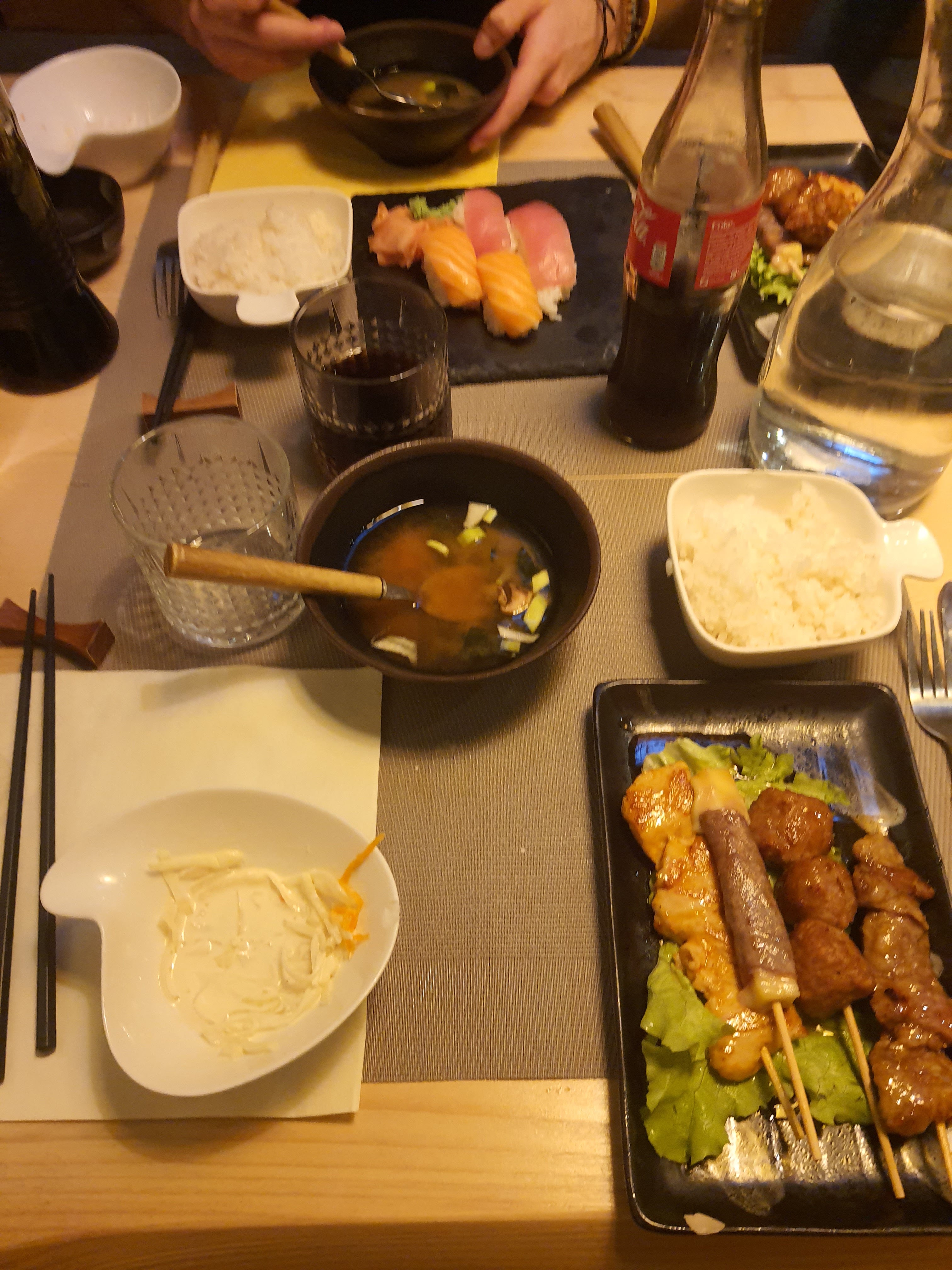 Il y a longtemps que je n'ai pas mangé des sushis aussi bons. Commençons par le commencement Soupe miso, un peu trop diluée à mon goût. Salade de choux :bonne, sauf vinaigrée très sucrée mais agréable Les brochettes Boulettes de poulet délicieuses, poulet tendre et pas sec, bœuf un peu trop cuite, bœuf fromage très bonne Les sushis: parfaite tenue, taille parfait pour une bouchée totale. Le riz est aéré et parfaitement cuit, pas trop collant... Un véritable délice. Le bol de riz : idem très bo'the, pas trop salé.. Par contre mieux vaut maîtriser les baguettes car comme il comme moins que d'habitude, ce qui est parfait pour moi, il faut savoir attraper les grains de riz au fond du bol Une experience superbe... Et en plus, y a des mochis !!!