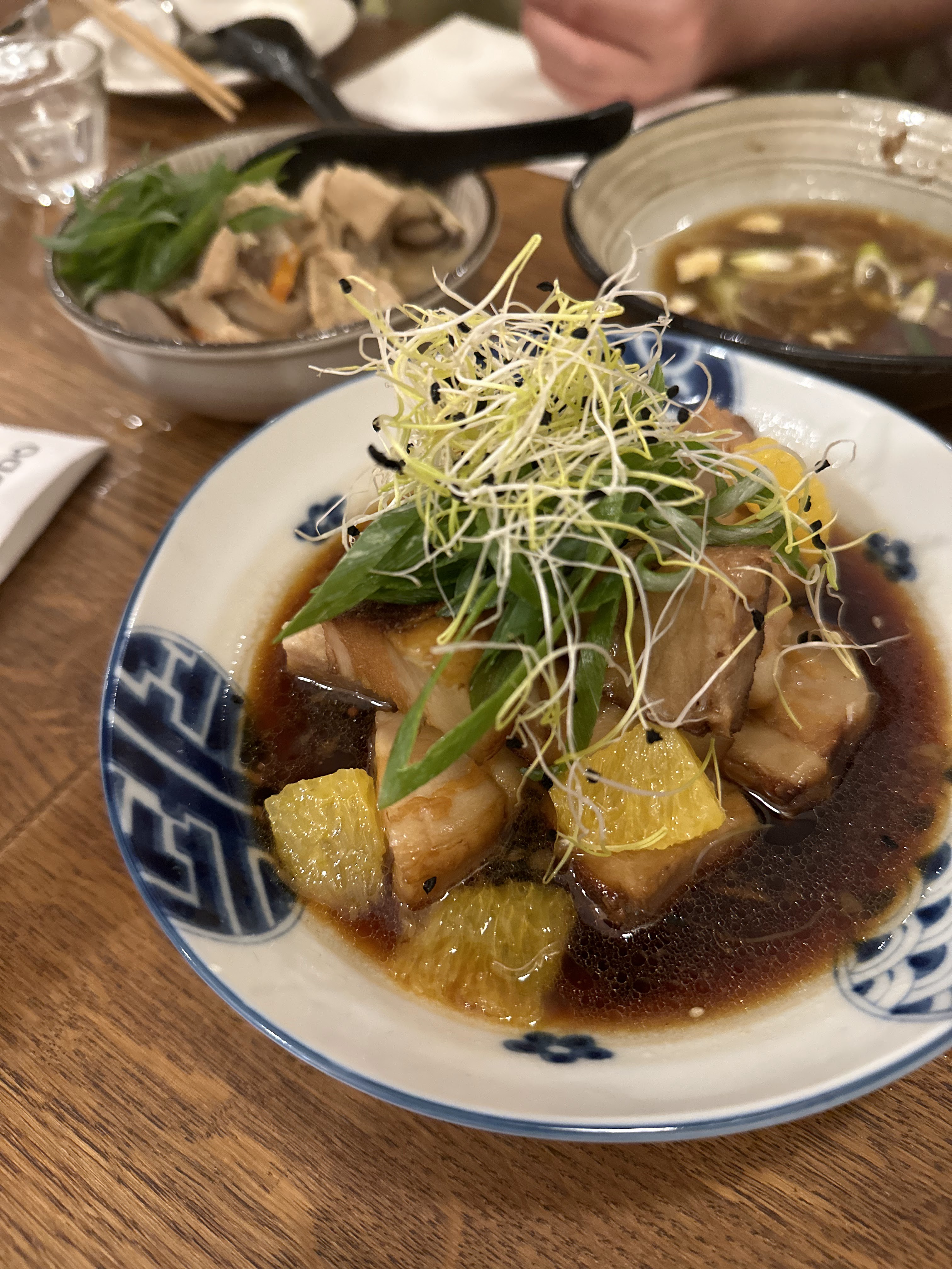 Petit resto japonais avec très peu de places. On est un peu les uns sur les autres … il faut réserver ! En mode petites assiettes à partager ! Tout était très bon : concombre mariné, pousse de bambou épicé, sashimi, assiette de porc fondant et épicé. En dessert cheese cake au matcha !