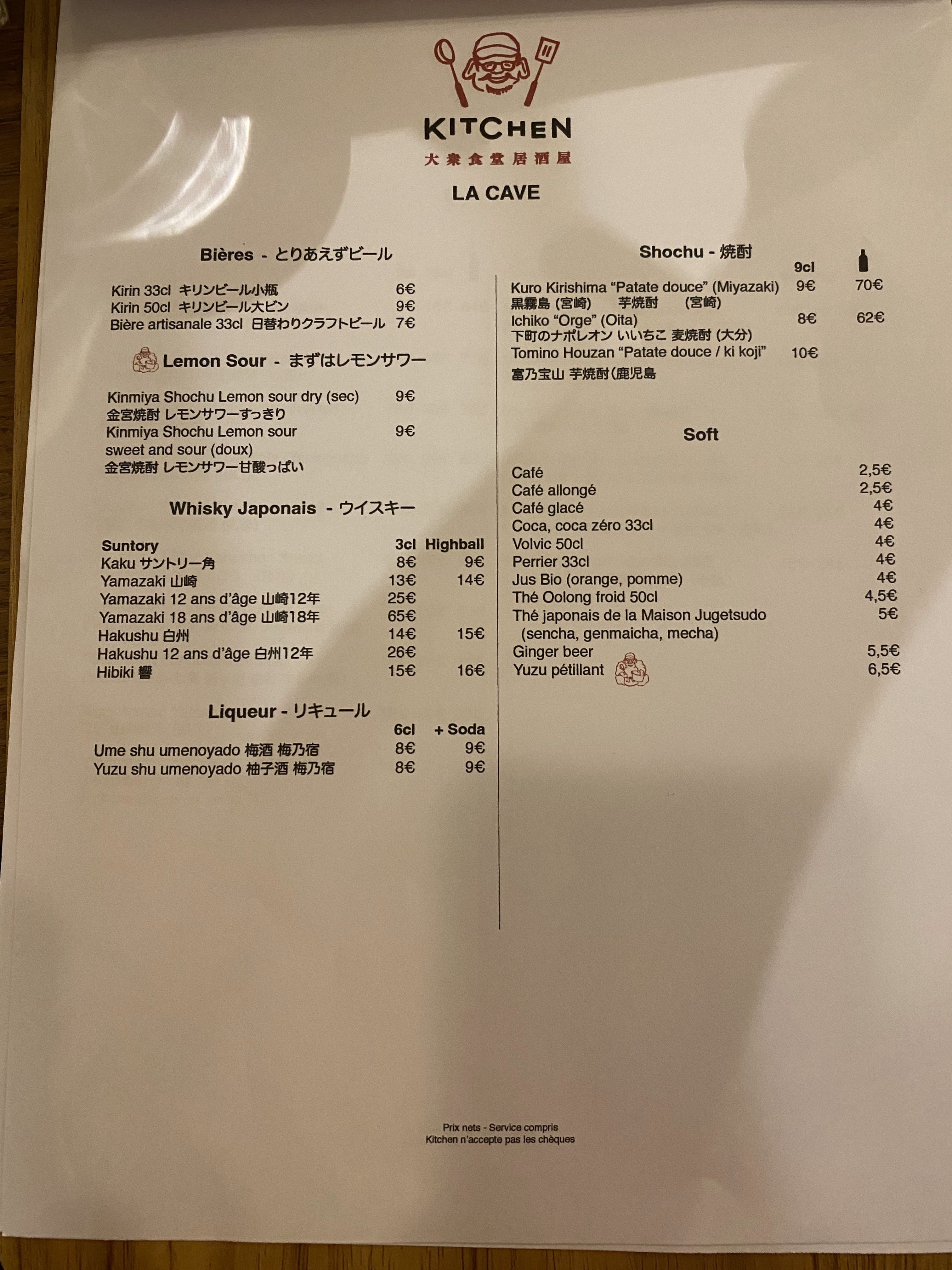 La cuisine business dans toute sa splendeur. On te fait croire à un peu d’authenticité (enfin vite fait) et en réalité tu manges beaucoup de surgelés! Mes Ramen au porc (20€) ressemblaient plus à un tranche de rôti de porc coupé en morceaux avec des pâtes…franchement c’est pas sérieux et donc très cher! On mise simplement sur un joli visuel mais ce n’est pas suffisant. Ce restaurant est à peu près aussi authentique que Ippudo, quelques rues plus loin et…kitchen Izakaya appartient à Ippudo d’après ma facture. IPO m’avait fait la même impression alors si j’avais su que c’était la même maison je n’aurai certainement pas réservé. On est donc sur une déclinaison de la pseudo nourriture Japonaise en mode Tapas surgelées ici. Je ne parle même pas du dessert maison…la blague. Un cheese cake de 5cm par 5cm arrosé de jus d’orange. Le service est plutôt agréable même si on sent la pression du second service très clairement. Donc l’idée c’est de pas traîner. On enchaîne, on te propose la note dès que t’as fini ton dessert…bref, la cuisine business dans toute sa splendeur. 1 apéritif 1 tapa 1 plat 1/2 dessert (partagé) = 43€ lol